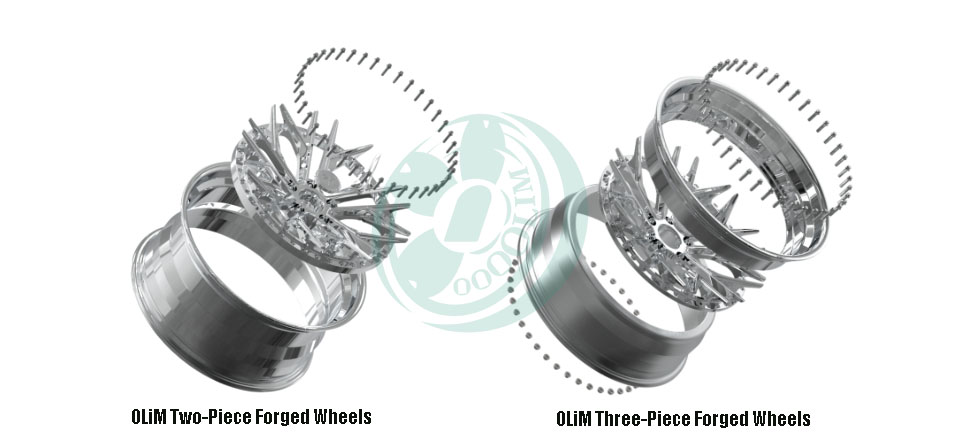 OLiM 3-delade smidda hjul är mästerverk av anpassat konstnärskap. Mittskivan, den inre cylindern och den yttre läppen är separata komponenter, noggrant sammansatta med bultar av flyg- och rymdkvalitet och patenterade tätningslösningar. Varje del kan anpassas oberoende.